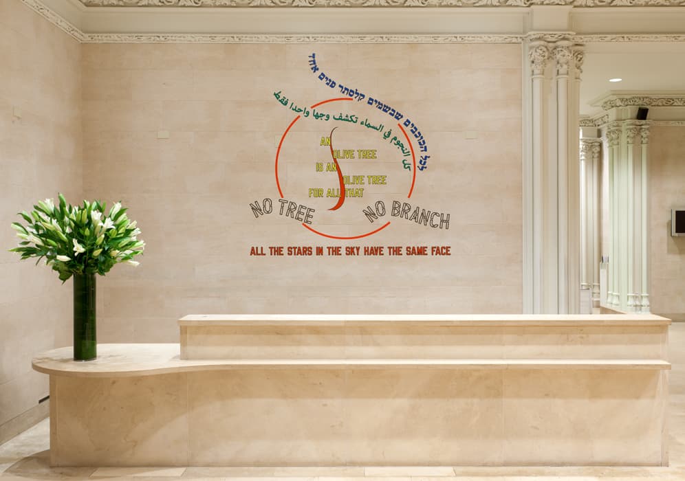 Combining wall texts with abstracted icons, NO TREE NO BRANCH began with the Yiddish saying, “Ale yevonim habn eyn ponim”—all Greeks (i.e., non-Jews) have the same face. This phrase, inherently isolationist and mistrustful of the “Other,” gained currency during the antisemitic upheavals of nineteenth- and early twentieth-century Europe. By tweaking the text to read “All the Stars in the Sky Have the Same Face” and by translating it simultaneously into English, Hebrew, and Arabic, Weiner transforms its meaning into a humanist statement. The branch form that punctuates the texts can be read as a plain, unambiguous shape (Weiner uses the word “fact”). Yet it also bears deep symbolic meanings—the olive branch of peace, the tree of life. The artist considers this work as his “contribution to the dialogue.”